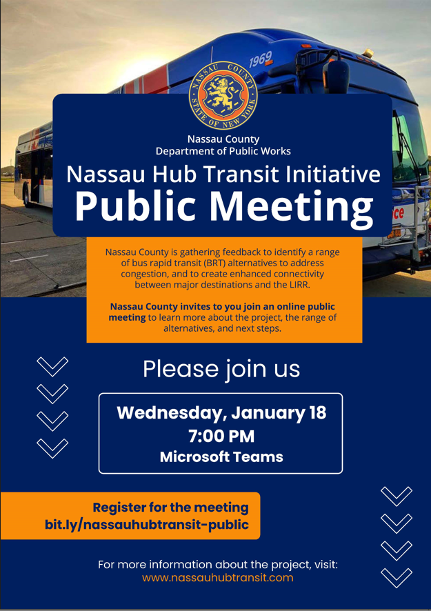 Nassau County's DPW is holding a pubic meeting about its new Bus Rapid Transit system proposal. Please join us and give us your feed back on this exciting new service for the Nassau Hub!